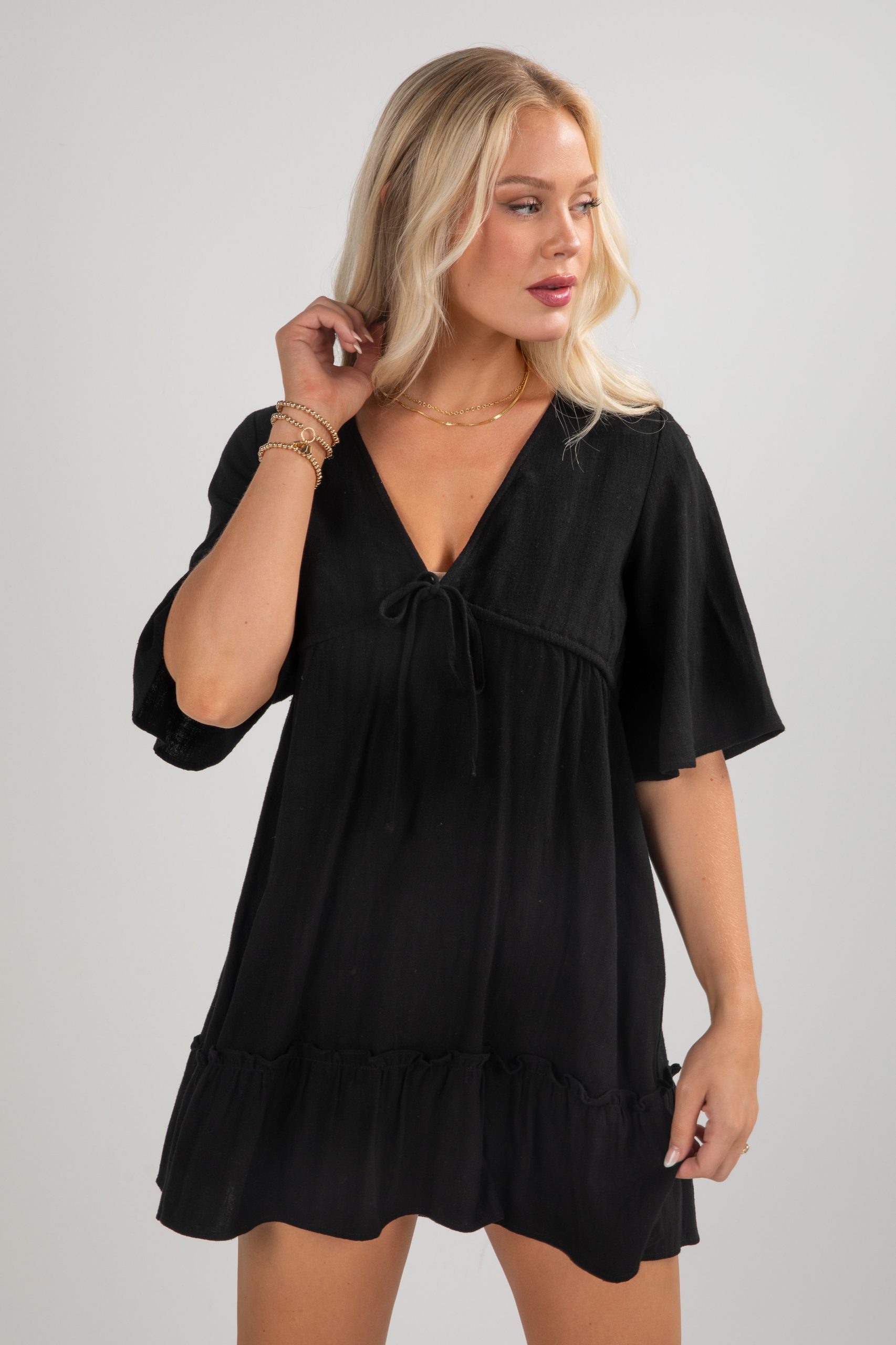 Add a little edge to your adorable OOTD with the Refined Radiance Babydoll Mini Dress! Designed with a flattering V-neckline, a flowy babydoll silhouette, and a playful ruffle hem, this dress offers the perfect mix of comfort and style. The short sleeves make it versatile for warm days, while the mini length keeps it fun and fresh. Pair it with sandals for a casual daytime look or dress it up with heels and accessories for a night out! Available in 2 colors. Lightweight Linen-Blend Fabrication V-Neckline Functional Drawstring Tie Waistband Short Sleeves Flowy Babydoll Fit Ruffle Hem Made in the USA Short/Mini Length 80% Rayon, 20% Linen Hand Wash Cold, Hang or Line Dry Models are 5’4″ + 5’6″ and are wearing a Small.Garment Measurements in Inches:Small | Bust 38″ | Waist 36″ | Hips 48″ | Length 32″Medium | Bust 40″ | Waist 38″ | Hips 50″ | Length 32.5″Large | Bust 42″ | Waist 40″ | Hips 52″ | Length 33″X-Large | Bust 44″ | Waist 42″ | Hips 54″ | Length 34″